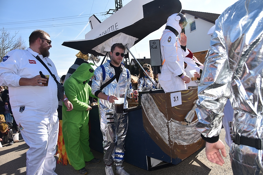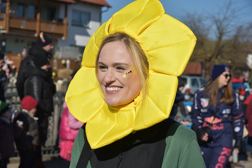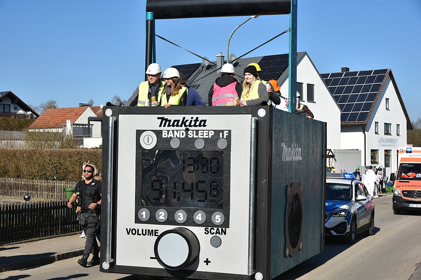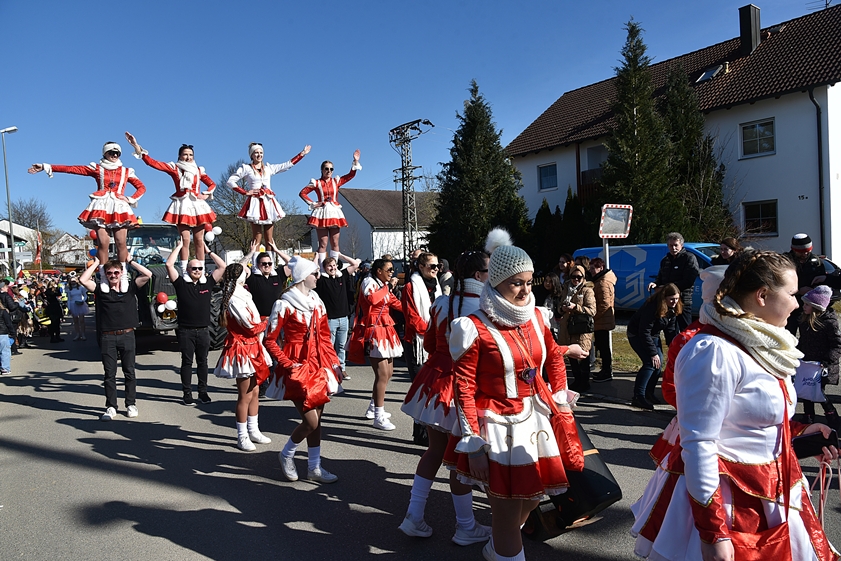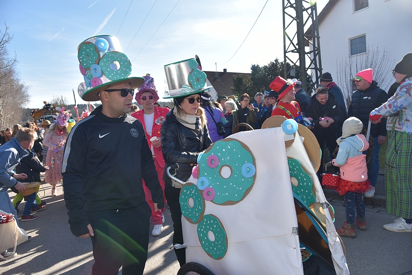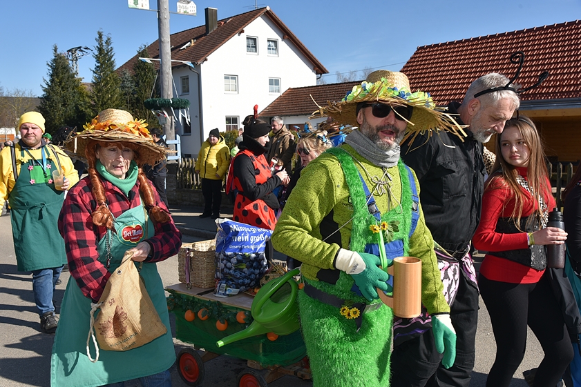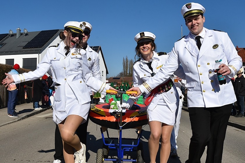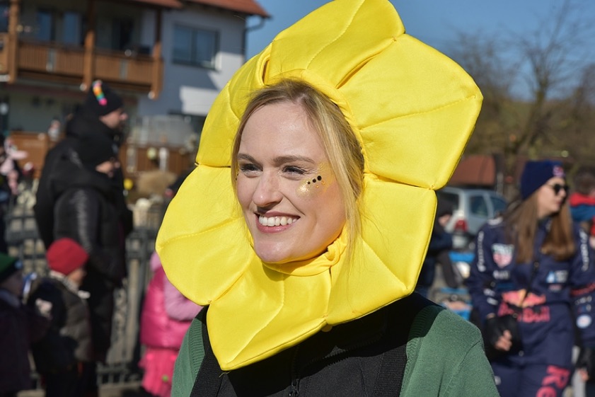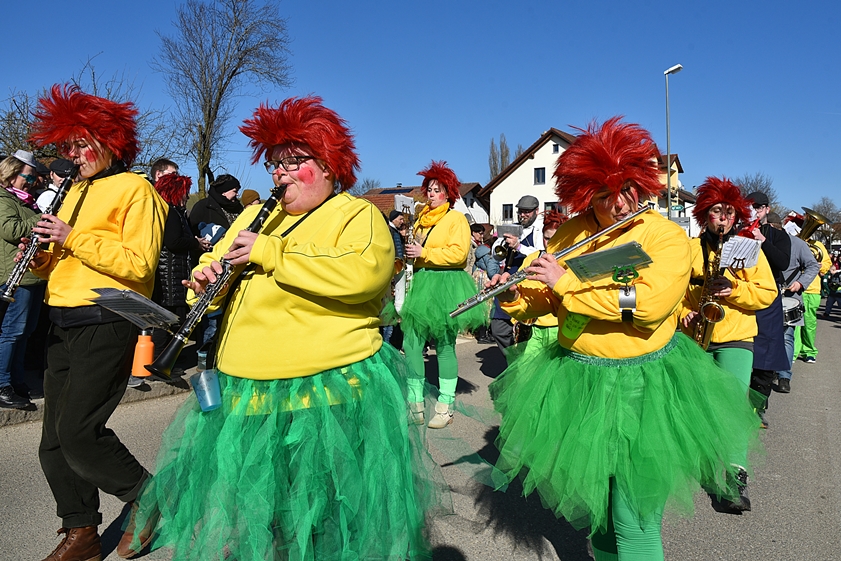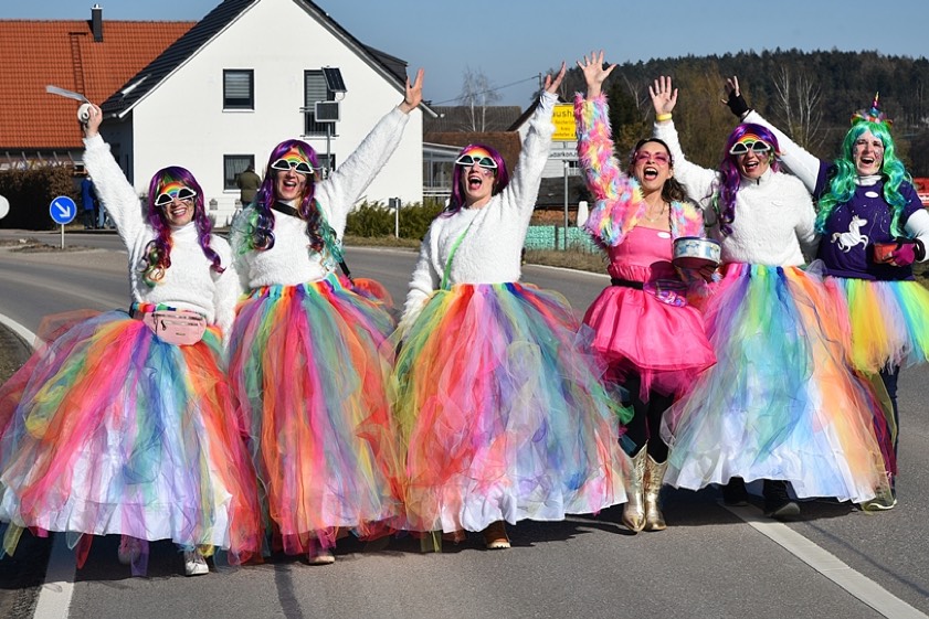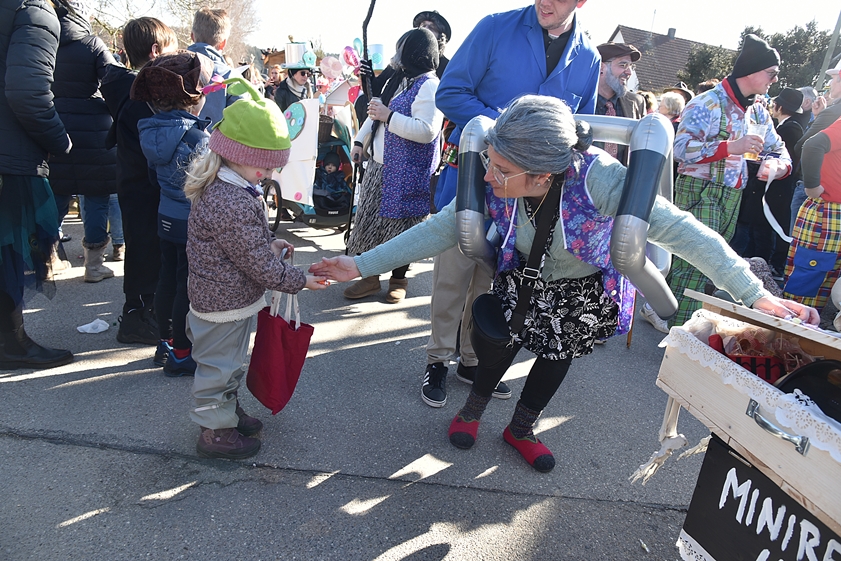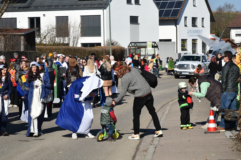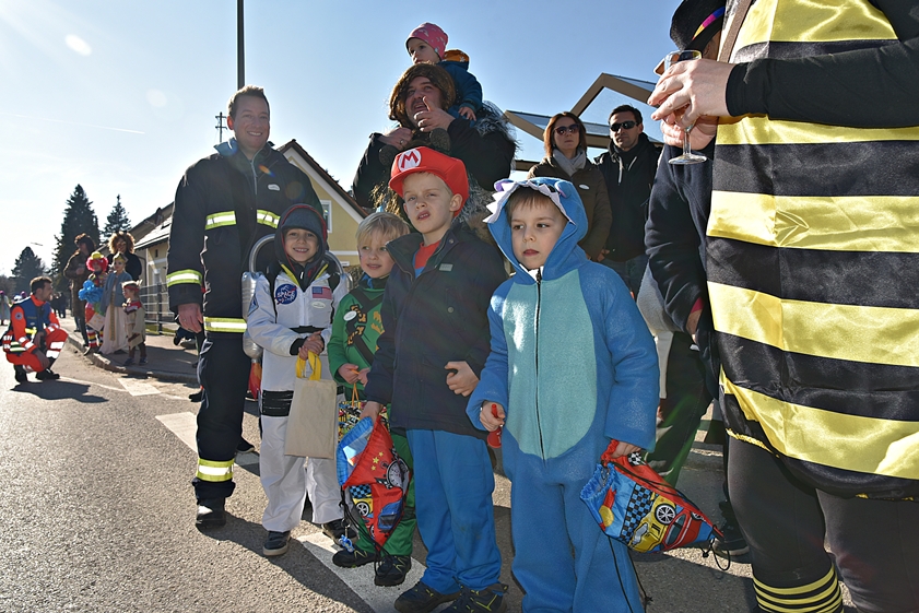 Zahlreiche Zuschauer verfolgten das närrische Spektakel, an dem etliche Wagen und viele Fußgruppen beteiligt waren. Der Tag klingt mit einer Party aus.