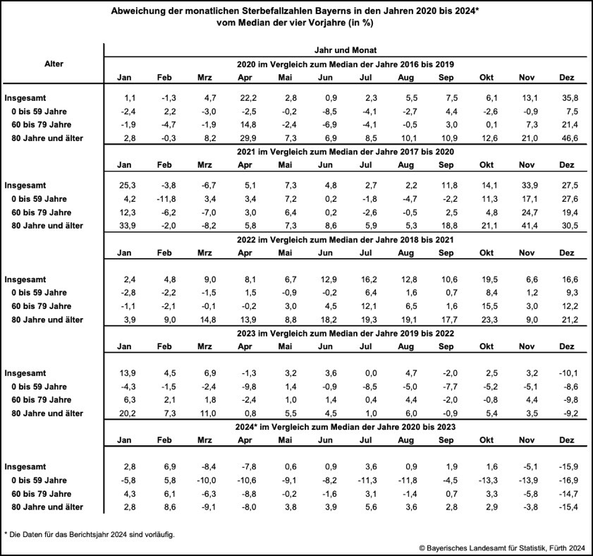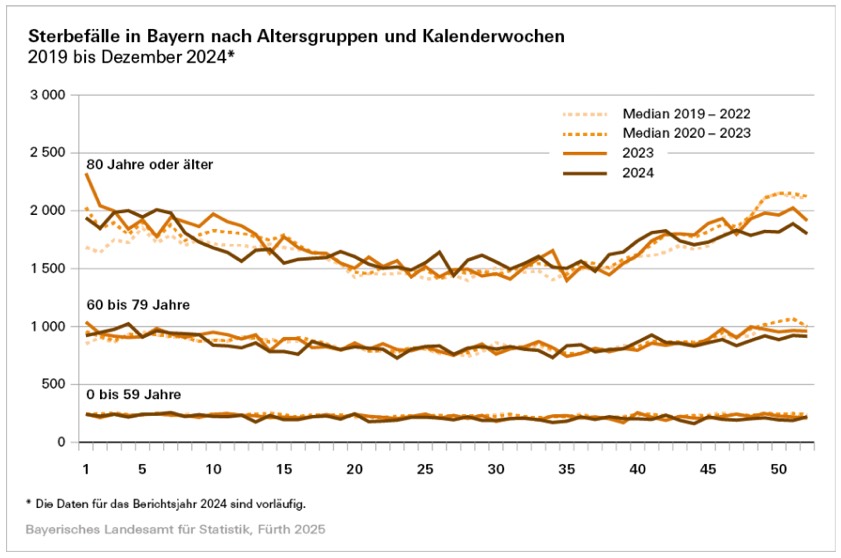 (ty) Wie das bayerische Landesamts für Statistik nach der Auswertung von vorläufigen Daten jetzt bekannt gegeben hat, sind nach derzeitigem Stand im Dezember des vergangenen Jahres im Freistaat insgesamt 13 069 Menschen gestorben. Diese Zahl liegt nach Angaben der Behörde damit insgesamt knapp 16 Prozent unter dem Niveau des Medians* der Jahre 2020 bis 2023 (15 545 Verstorbene). Dabei sei jedoch zu beachten, "dass in die Berechnung des Medians der Jahre 2020 bis 2023 teilweise Jahre mit pandemie-bedingt hohen Sterbefall-Zahlen einfließen, wodurch der Vergleichswert für das Jahr 2024 relativ hoch ist".