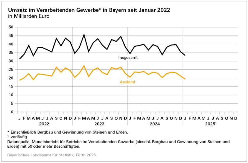 (ty) Im Januar dieses Jahres hat das verarbeitende Gewerbe im Freistaat einen Umsatz-Rückgang von nominal 3,4 Prozent gegenüber dem Vorjahres-Monat hinnehmen müssen. Das wurde aus dem bayerischen Landesamt für Statistik gemeldet. Das verarbeitende Gewerbe, bezogen auf Betriebe mit 50 oder mehr Beschäftigten, umfasst dabei auch immer den Bergbau sowie die Gewinnung von Steinen und Erden. Der Personalstand des verarbeitenden Gewerbes in Bayern lag Ende Januar heuer bei 1,179 Millionen Beschäftigten – das waren gut 14 200 Personen oder 1,2 Prozent weniger als ein Jahr zuvor.