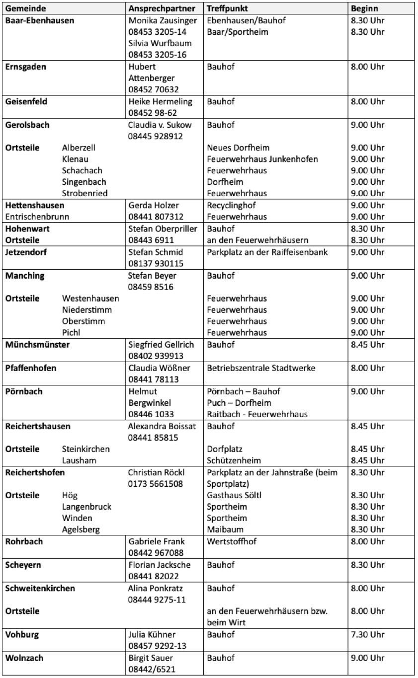 Hier die Treffpunkte, Startzeiten und Ansprech-Partner in den einzelnen Gemeinden im Überblick. AWP spendiert den Kommunen zehn Euro pro Teilnehmer.