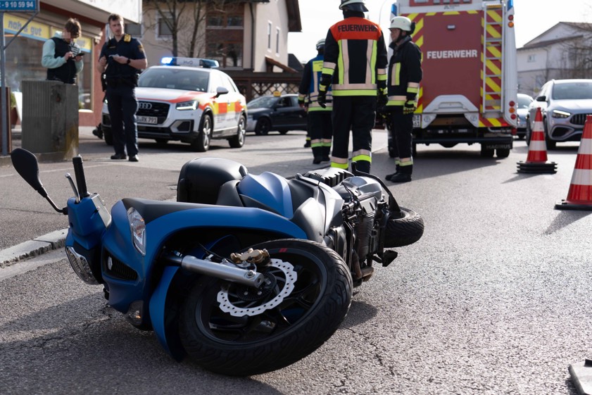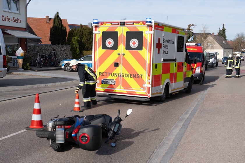 Der 78-Jährige prallte laut Polizei mit seinem Leichtkraftrad ins Heck des abgebremsten Autos und kam daraufhin zu Sturz. Dabei habe sich der Motorroller-Fahrer eine Bein-Verletzung zugezogen. Vom alarmierten Rettungsdienst sei er in eine Krankenhaus gebracht worden. Auch die Feuerwehr aus Mühlried war im Einsatz, um die Unfallstelle abzusichern. Der bei der Kollision entstandene Sachschaden wurde von Streifenbeamten auf 1000 Euro geschätzt.