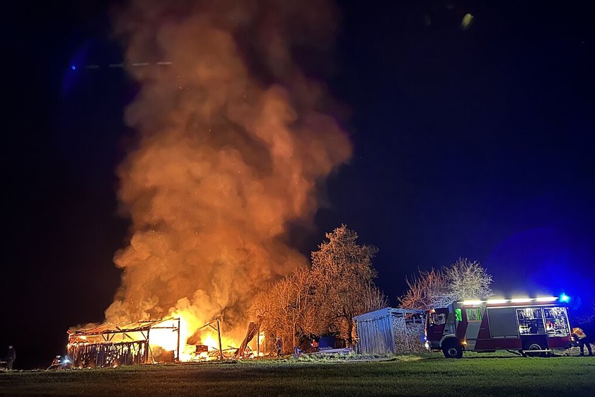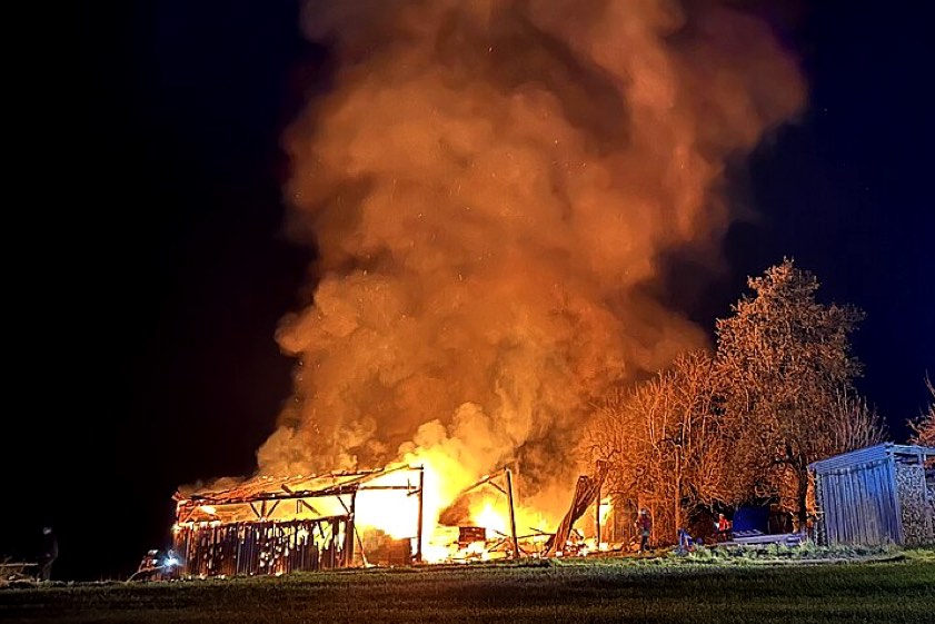 Nach Angaben der Polizei hatte gegen Mitternacht ein vorbeikommender Pkw-Lenker den Brand im Bereich des Ortsteils Tegernbach, in der Verlängerung der Straße "Hennenfeld", bemerkt und Alarm geschlagen. Als die Feuerwehrleute eingetroffen seien, habe die etwa 250 Quadratmeter umfassende Scheune bereits im Vollbrand gestanden. Das Gebäude sowie die darin gelagerten landwirtschaftlichen Arbeitsgeräte seien komplett zerstört worden. Die Lösch-Arbeiten dauerten nach Angaben der Polizei etwa zwei Stunden an; die Nachlösch-Maßnahmen zogen sich laut Feuerwehr bis 3 Uhr.