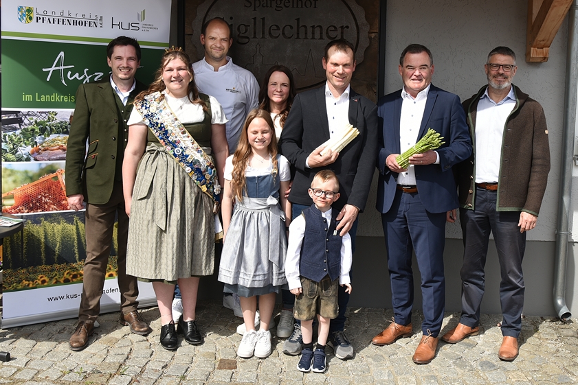 (ty) Weißes Gold aus der Region gibt es jetzt wieder frisch vom Feld. Das symbolische Start-Signal zur diesjährigen Spargel-Saison im Landkreis Pfaffenhofen ist heute auf dem Sigllechner-Hof in Hohenwart gegeben worden. Gekommen waren neben Landrat Albert Gürtner (FW) und dem hiesigen Bürgermeister Jürgen Haindl (FW) auch die amtierende Schrobenhausener Spargelkönigin Elisabeth IV. sowie Thomas Schwarzbauer vom örtlichen Gasthaus "Metzgerbräu" als Vertreter des bayerischen Hotel- und Gaststätten-Verbands. Die traditionelle Veranstaltung fand auf Initiative des Kommunal-Unternehmens für Struktur-Entwicklung im Landkreis (KUS) statt; dessen Chef Johannes Hofner war freilich ebenfalls vor Ort.