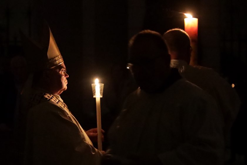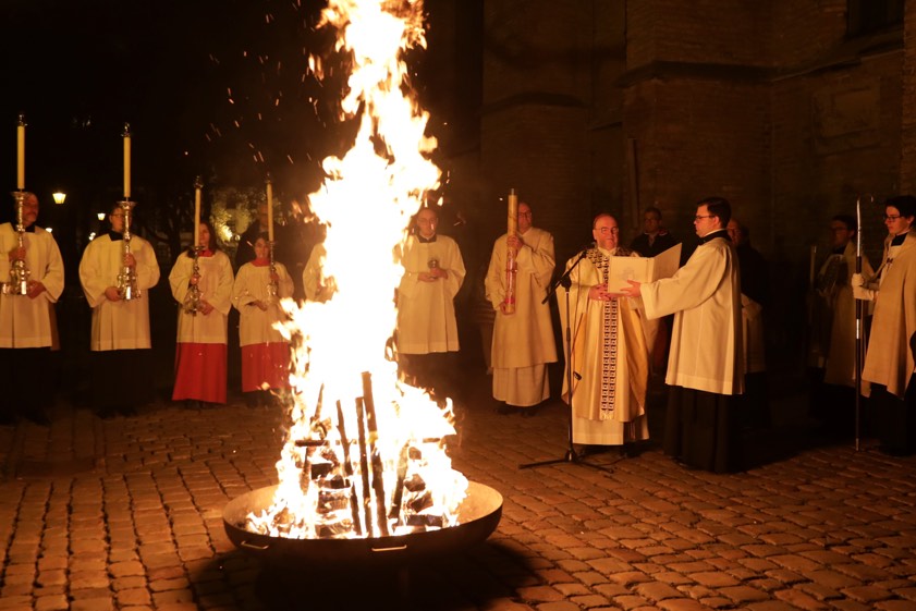 Zu Beginn der Osternacht zog der liturgische Dienst mit der Osterkerze in den dunklen Dom ein.