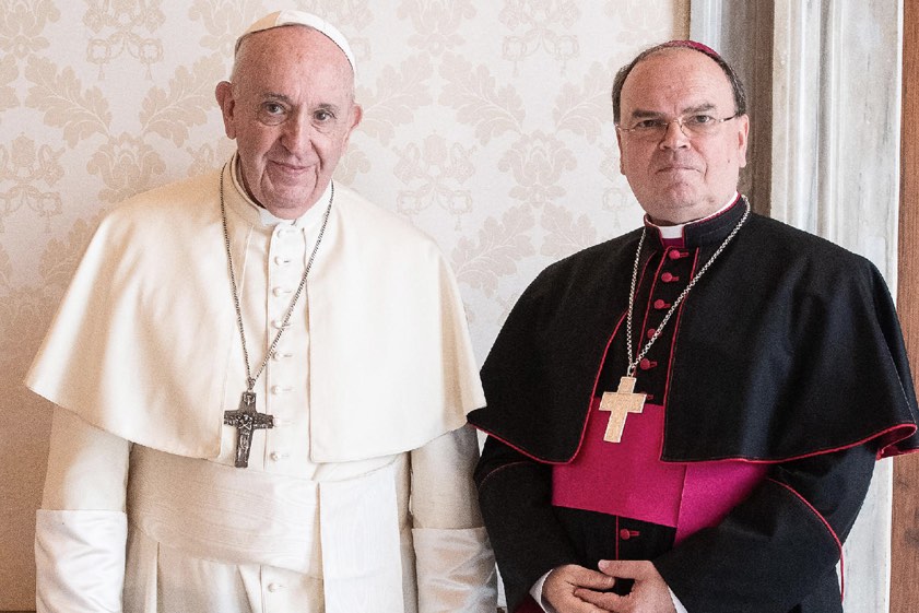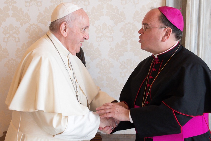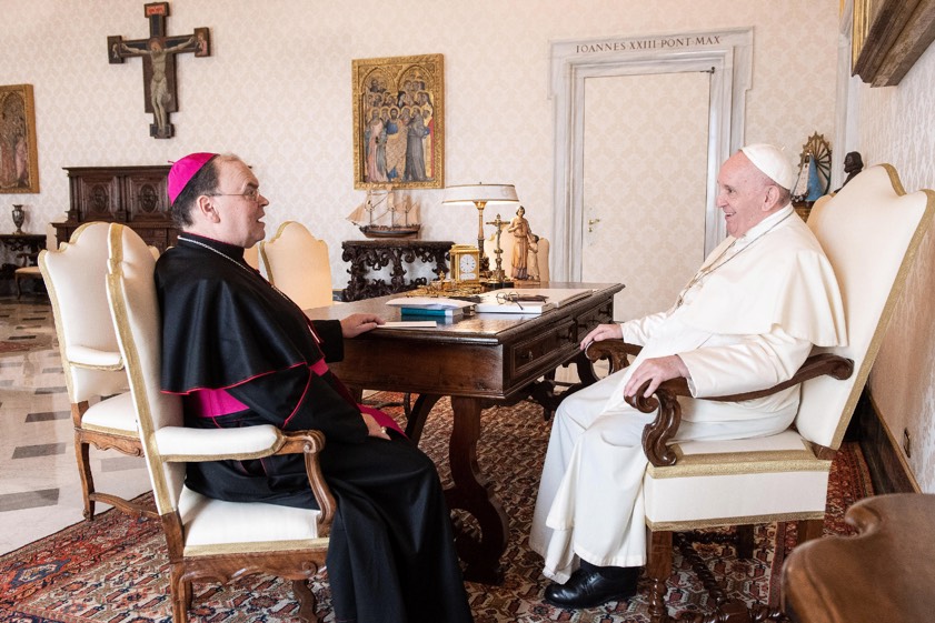 Bischof Bertram Meier und Papst Franziskus im Gespräch während einer Audienz im Vatikan am 10. September 2020.