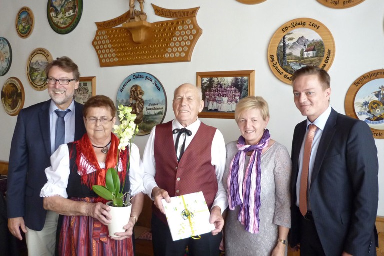 (ty) Theresia und Andreas Wagner aus Gröben in der Gemeinde Gerolsbach haben Diamantene Hochzeit gefeiert. Landrat Martin Wolf (links), der Landtagsabgeordnete Karl Straub (rechts) und Vize-Bürgermeisterin Gerti Schwertfirm (Zweite von rechts) gratulierten dazu, zollten Respekt und wünschten für die Zukunft alles Gute.