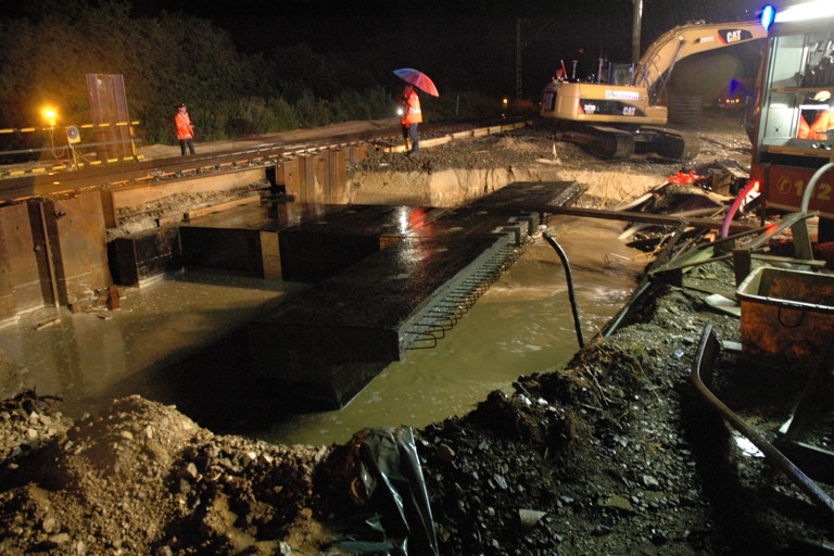Bei Affalterbach wurde an der Kreuzmühle eine Bahnbaustelle unterspült. Sorgen machte hier laut Seemüller unter anderem ein frisch betonierter Abwasser-Durchlass. Im Einsatz waren hier dann vor allem die Freiwillige Feuerwehr von Uttenhofen und die Kräfte des THW. Das THW war hier die ganze Nacht – von gestern 22 Uhr bis heute 9.30 Uhr – mit 20 Mann im Einsatz. An der Baustelle lief eine Baugrube voll und drohte die Gleise zu unterspülen, berichtet ein THW-Sprecher. Mit Hochleistungstauchpumpen wurde die Feuerwehr unterstützt, um den Pegel konstant zu halten. Wie das THW beichtet, wurde im Laufe der Nacht sage und schreibe fünf Millionen Liter Wasser in angrenzende Flächen umgeleitet.