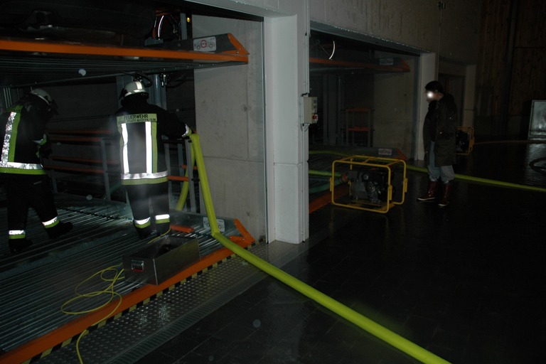 Ein zeitraubender Einsatz stand heute Nacht für die Pfaffenhofener Feuerwehrleute in der Dr.-Bergmeister-Straße an, wo eine Tiefgarage mit Duplex-System unter Wasser stand. „Mit schweren Pumpen“, wie Seemüller berichtet, seien die Einsatzkräfte hier von 22.45 Uhr bis etwa 2.30 Uhr beschäftigt gewesen, um dem Wasser Herr zu werden.
