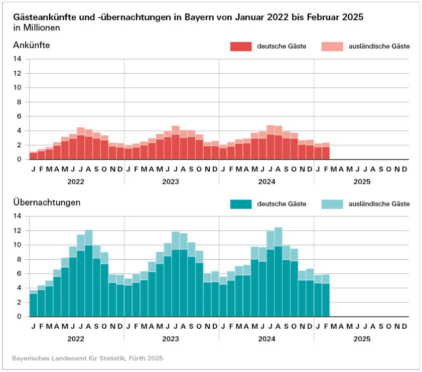 (ty) Für den Februar dieses Jahres hat das bayerische Landesamt für Statistik eine rückläufige Entwicklung beim Tourismus registriert. Sowohl die Gäste-Ankünfte (minus 3,3 Prozent) als auch die Übernachtungs-Zahlen (minus 7,2 Prozent) gingen im Vergleich zum Vorjahres-Monat zurück. Nach Angaben der Behörde übernachten im genannten Monat heuer rund 2,4 Millionen Gäste insgesamt 5,9 Millionen Mal in einem der gut 10 600 geöffneten Beherbergungs-Betriebe im Freistaat. Eine mögliche Erklärung für die Rückgänge sind die späteren diesjährigen Faschings-Ferien, die heuer in Bayern in den März fielen – statt wie im vergangenen Jahr in den Februar.