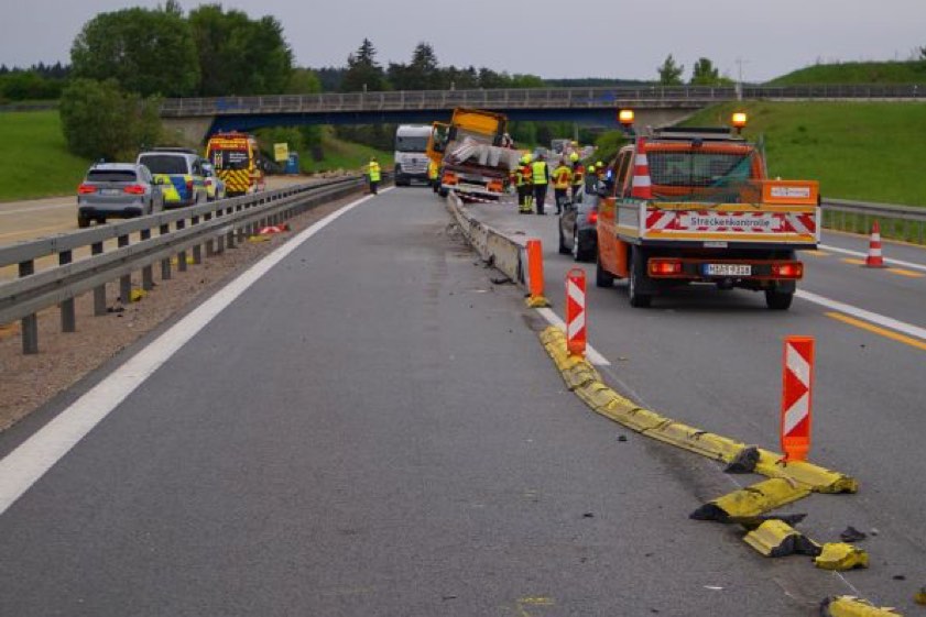 (ty) Nach einem Lastwagen-Unfall, der sich am heutigen Morgen im Landkreis Kelheim ereignet hat, ist die A93 für mehrere Stunden komplett gesperrt gewesen. Das Unglück geschah gegen 6.25 Uhr zwischen den Autobahn-Anschlussstellen Bad Abbach und Saalhaupt in Fahrtrichtung Holledau. Nach Angaben der Polizei kam ein 54-Jähriger "aufgrund einer körperlichen Ausfall-Erscheinung" mit seinem Sattelzug im Baustellen-Bereich nach Links von der Fahrbahn ab und kollidierte dort mit der Beton-Gleitwand. Der Lkw sei auf den Beton-Teilen zum Stehen gekommen und habe noch einen entgegenkommenden Kleintransporter touchiert, der von einem 38-Jährigen gelenkt worden sei.