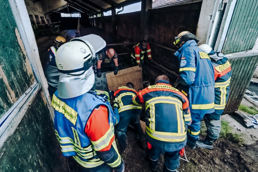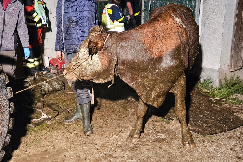 Wie die Kreisbrandinspektion berichtet, war auf dem landwirtschaftlichen Betrieb ein Boden-Element im Stall eingebrochen. Eine ausgewachsene Kuh sei durch die entstandene Öffnung in den darunter befindlichen Gülle-Behälter gestürzt. "Die Lage war kritisch", erklären die Floriansjünger: "Das Tier stand bis zu den Schultern in der zähen Flüssigkeit und konnte sich aus eigener Kraft nicht mehr befreien." Mit technischem Know-How und schwerem Gerät sei von den Einsatzkräften eine erweiterte Rettungs-Öffnung geschaffen worden.