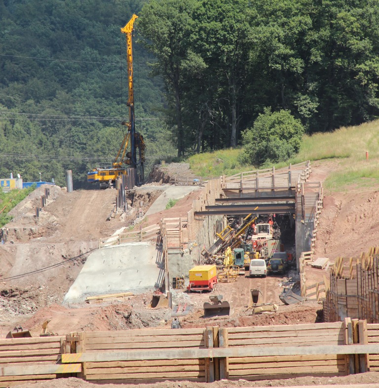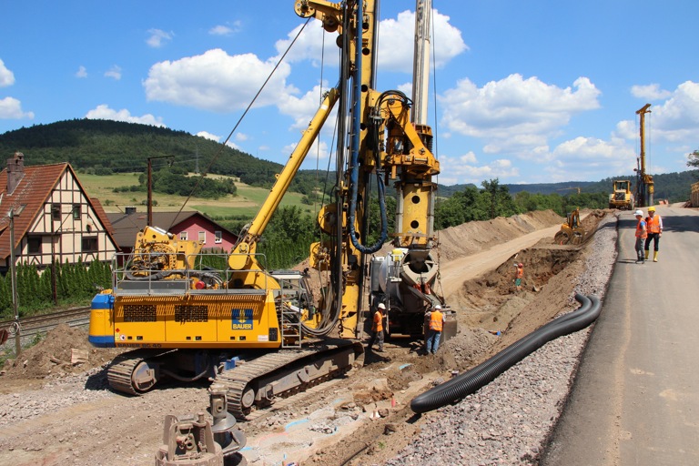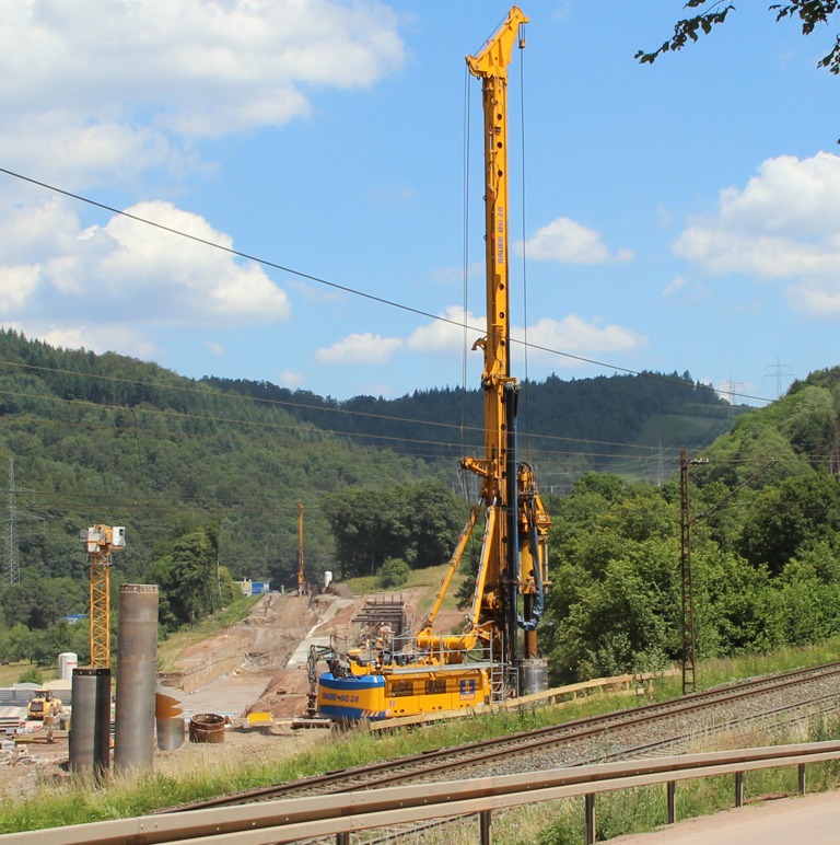 Die Herstellung der Pfähle mit Durchmesser zwischen 900 und 1500 Millimeter erfolgt im harten Diorit, Gneis und Bundsandstein. Sie reichen bis in eine Tiefe von 25 Metern wo sie bis zu fünf Meter in Fels eingebunden werden. Die Bauzeit der neuen Bahnstrecke reicht von Herbst vergangenen Jahres bis Ende 2017. Die wesentlichen Arbeiten von Bauer sollen dabei im Herbst kommenden Jahres abgeschlossen sein.