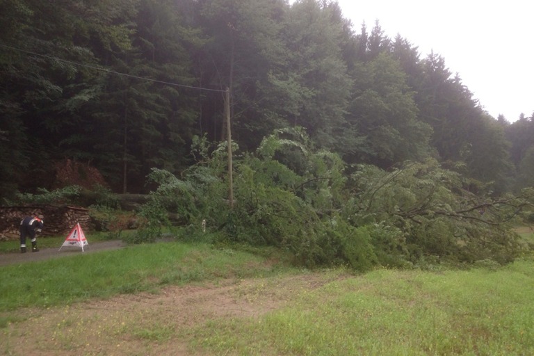 Am Vormittag mussten die Feuerwehrler bereits kurz nach 9 Uhr wegen eines umgestürzten Baums ausrücken. Der lag entwurzelt quer über der Straße. Kurze Zeit später drohte ein weiterer Baum durch seine starke Schieflage auf eine Straße zu stürzen. Beide Bäume wurden unter dem Einsatz von Motorsägen soweit beseitigt, dass keine Gefahr mehr bestand.