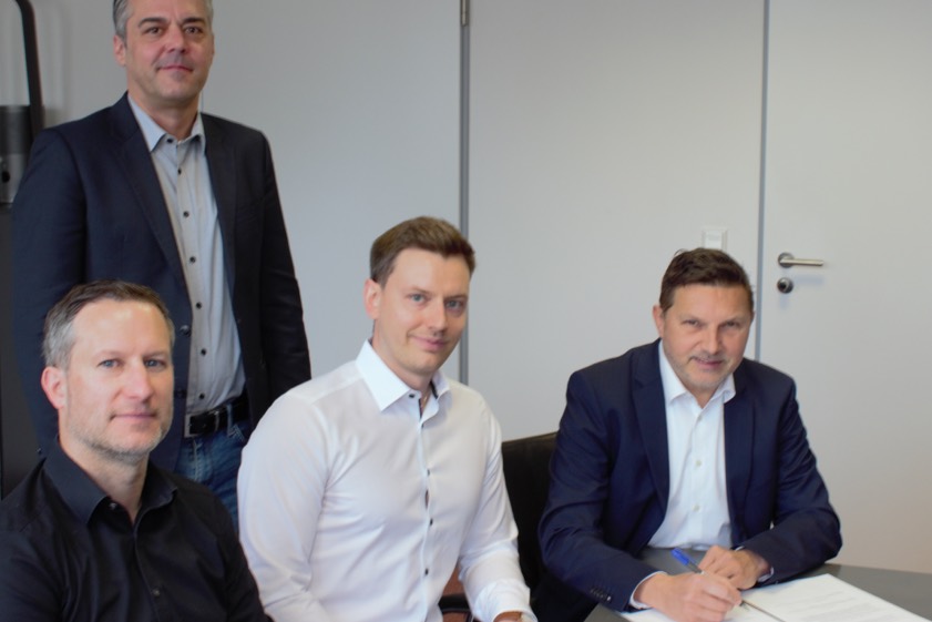 Die Verträge sind unterzeichnet. Hinten Bürgermeister Thomas Herker und vorne, von links: Michael Jakuttis (Danpower), Felix Reichenbach (Danpower), Thomas Wiringer (Stadtwerke).