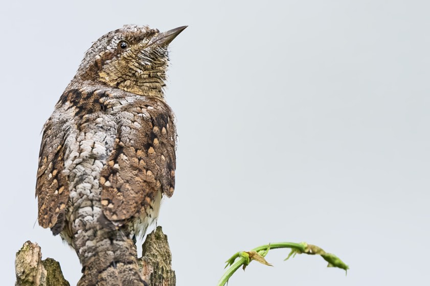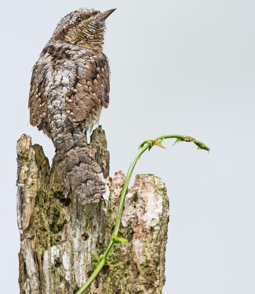 Oben sehen Sie einen Ausschnitt, unten das komplette Hochformat-Motiv. "Bei Gefahr macht der Wendehals seinem Namen alle Ehre", erklärt uns Rainer Schaaf: "Er plustert sich auf und dreht und wendet seinen Kopf hin und her." Diese Aufnahme sei für den Wendehals allerdings völlig gefahrlos gewesen, versichert Schaaf. Er habe sich zum Fotografieren nämlich in einem Tarnzelt befunden und sei deshalb für den Vogel gar nicht erkennbar gewesen.