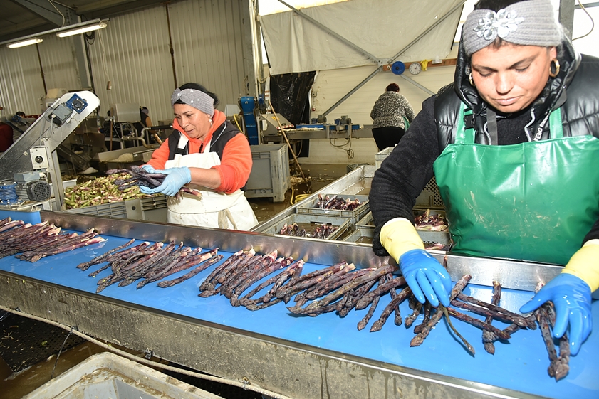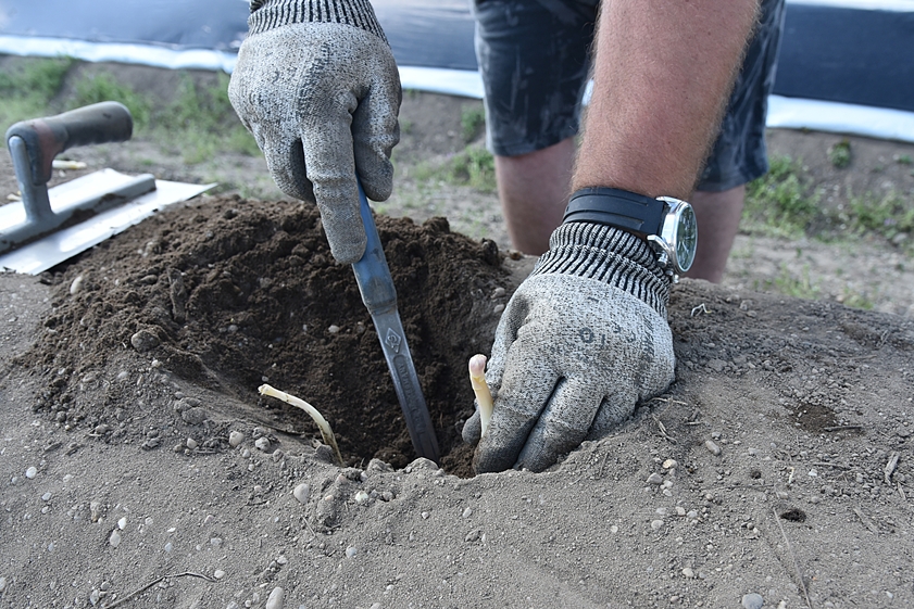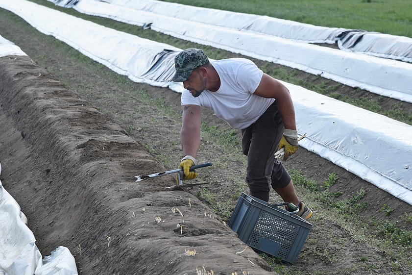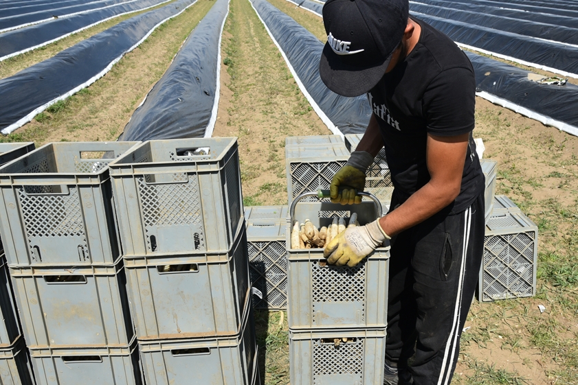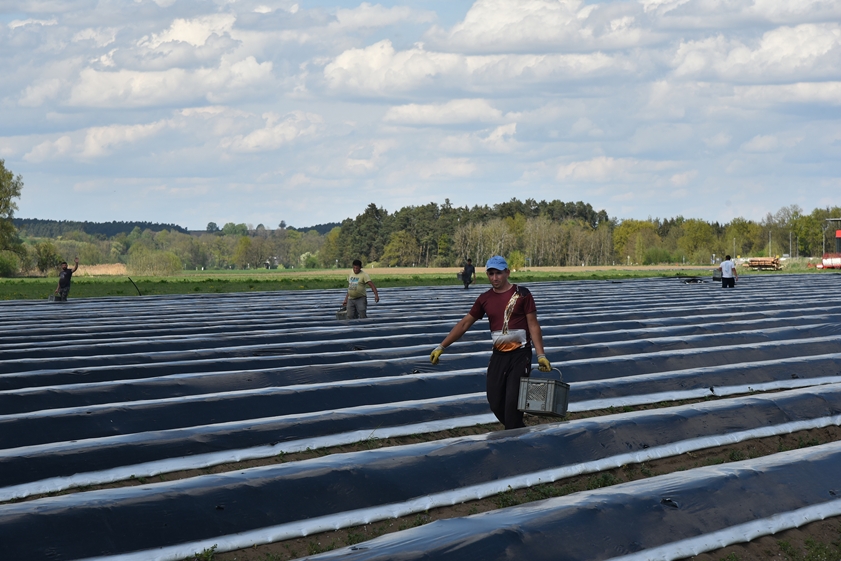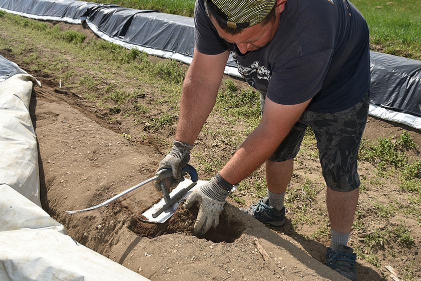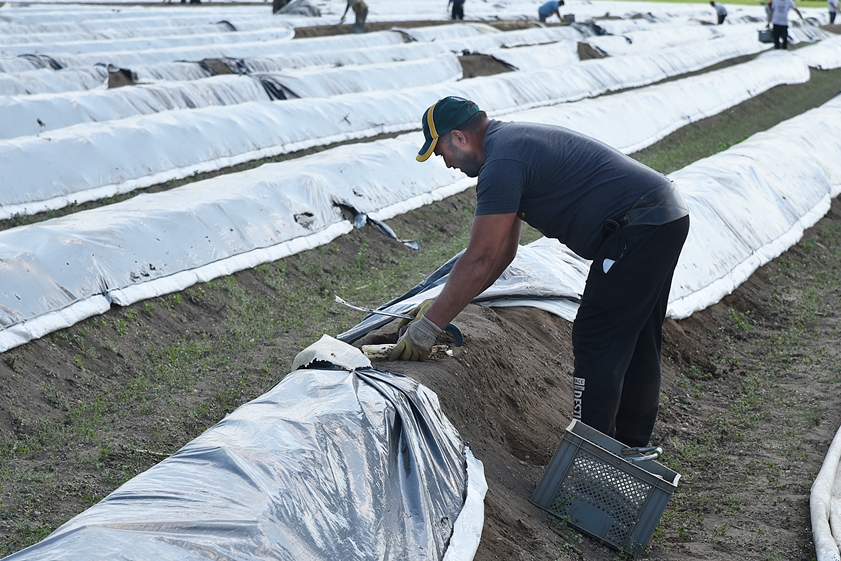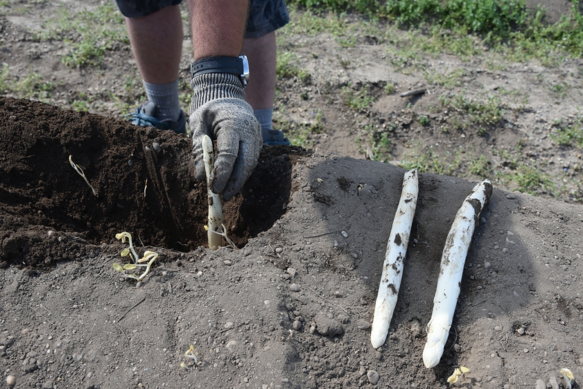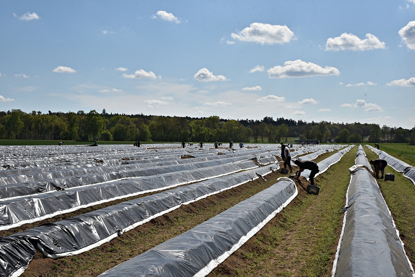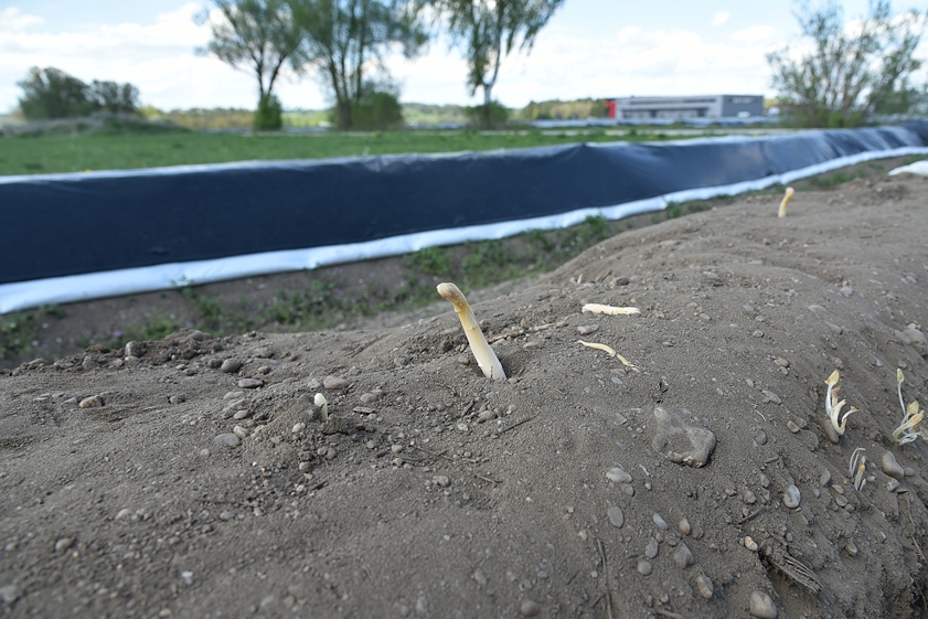 Dank der Folien sind die Stangen leichter sichtbar und zudem leichter zu stechen. Allerdings müssen die nicht gerade leichten Abdeckungen jeden Tag beiseite geschoben werden, damit die Spargel-Stecher erst mit einem speziellen Messer und dann wieder zum Schließen des aufgegrabenen Loches im Damm mit einer Kelle zu Werke gehen können.