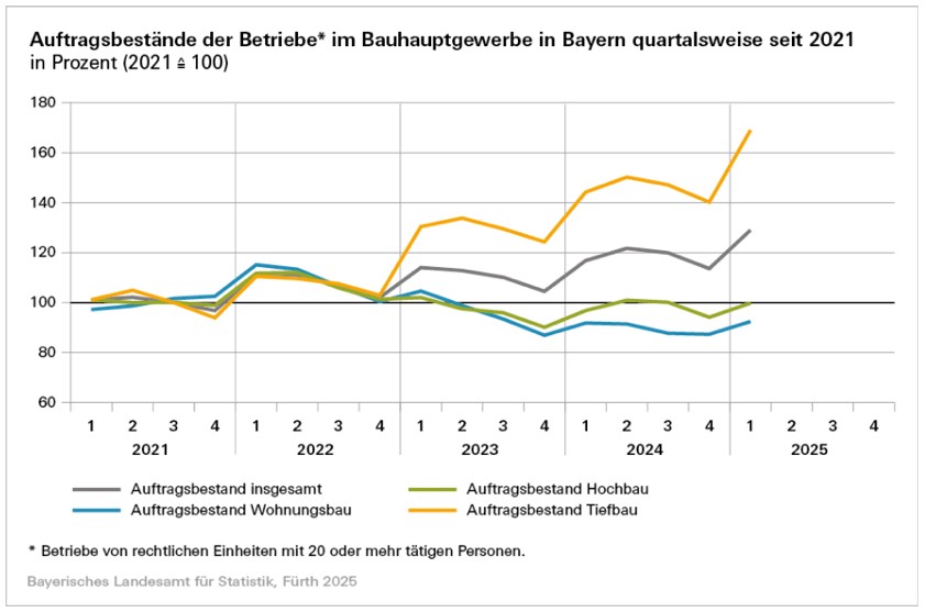 (ty) Zum Ende März dieses Jahres hat der Auftrags-Bestand im bayerischen Bauhauptgewerbe bei einem Gesamtwert von 17,59 Milliarden Euro gelegen. Das entspricht einer Steigerung um 1,66 Milliarden Euro beziehungsweise 10,4 Prozent gegenüber dem Vorjahres-Zeitpunkt. Nach weiteren Angaben des Landesamts für Statistik wurden insbesondere für den gewerblichen und industriellen Tiefbau wertmäßig höhere Auftrags-Bestände als vor Jahresfrist festgestellt.