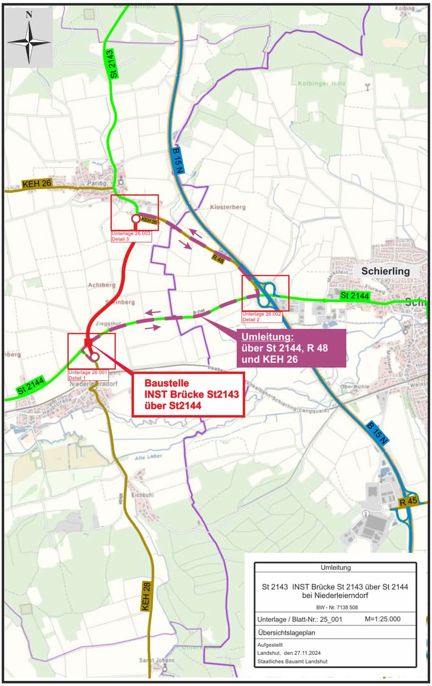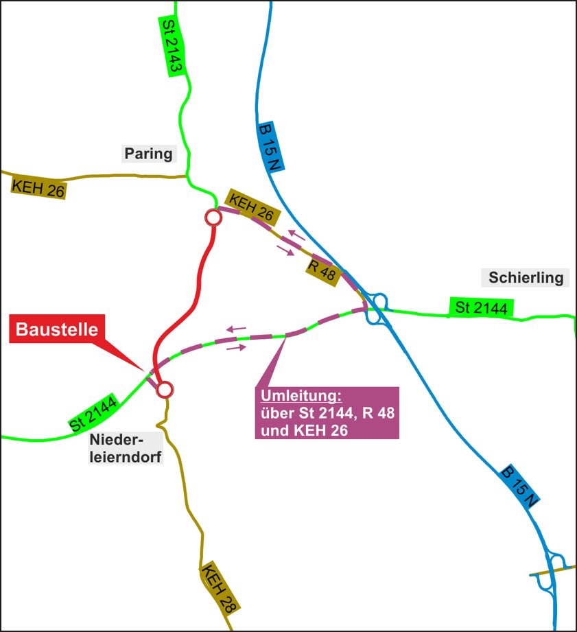 Die Umleitung in beide Fahrtrichtungen führt nach Angaben des staatlichen Bauamts über die Staatstsraße 2144, die Kreisstraße R48 und die Kreisstraße KEH26. Voraussichtlich ab Montag, 2. Juni, sei – wegen des Einbaus eines Traggerüstes – auch mit Verkehrs-Einschränkungen auf der Staatsstraße 2144 zu rechnen; "diese beschränken sich auf wenige Tage". Im Zuge der Brückenbau-Arbeiten werde auch die Fahrbahn der Staatsstraße 2143 von der Kreuzung bei Langquaid-Paring bis zur Auffahrt bei Niederleierndorf erneuert. Der Freistaat investiere rund eine Million Euro in die beiden genannten Maßnahmen.