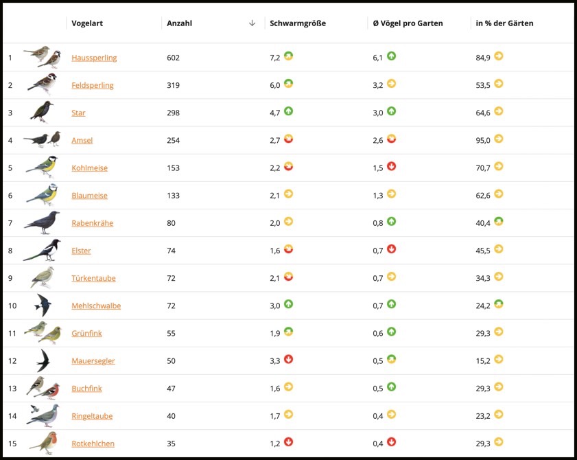 Das Siegertreppchen bleibt laut LBV-Auswertung das fünfte Jahr in Folge unverändert: Der Haussperling sichert sich Platz eins, gefolgt von der Amsel auf Rang zwei und dem Star auf Platz drei. Direkt dahinter flattert die Kohlmeise auf Rang vier – sie verbessert sich damit im Vergleich zum Vorjahr um eine Position und verweist den Feldsperling auf Platz fünf. Die Blaumeise belegt Platz sechs. Dahinter belegt die Elster auch in diesem Jahr ihren langjährigen Stammplatz: Zum 15. Mal in Folge landet sie auf Rang sieben. Auf die folgenden Plätze segeln Mauersegler (acht) und Mehlschwalbe (neun). Komplettiert wird die Top-Ten von der Rabenkrähe. Knapp außerhalb des Spitzenfelds liegt der Grünfink: Mit Platz elf verpasste er damit den Einzug in die Top-Ten zum dritten Mal in Folge. Insgesamt meldeten die rund 11 700 Teilnehmerinnen und Teilnehmer laut LBV heuer mehr als 215 000 Vögel.