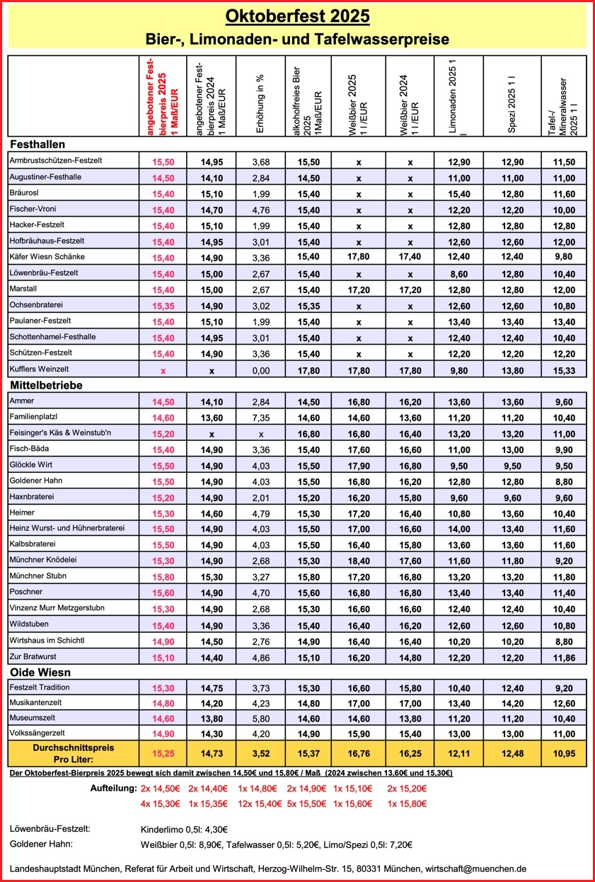 (ty) Die gastronomischen Betriebe haben dem Referat für Arbeit und Wirtschaft der Stadt München die von ihnen kalkulierten Getränke-Preise für das diesjährige Oktoberfest mitgeteilt. Demnach wird eine Maß Festbier heuer zwischen 14,50 und 15,80 Euro kosten – durchschnittlich 3,52 Prozent mehr als im vergangenen Jahr, als die Preisspanne von 13,60 bis 15,30 Euro reichte. Das wurde aus dem Rathaus bekannt gegeben. Die Durchschnitts-Preise der alkoholfreien Getränke betragen den Angaben zufolge pro Liter für Tafelwasser 10,95 Euro (Vorjahr: 10,48 Euro), für Spezi 12,48 Euro (Vorjahr: 12,23 Euro) und für Limonade 12,11 Euro (Vorjahr: 11,67 Euro).