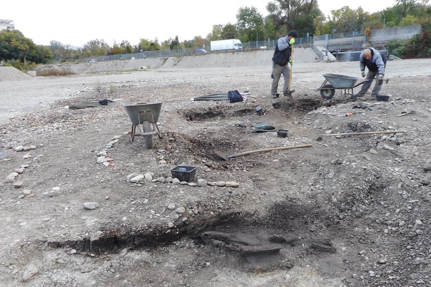 Grabungs-Situation im Wertach-Kies von Augsburg-Oberhausen.