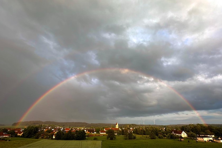 (ty) Und schon geht sie weiter, die Serie von beeindruckenden Fotos aus der Region, die uns unsere Leserinnen und Leser nach wie vor übermitteln. Die Aufnahme, die wir Ihnen am heutigen Pfingst-Montag zeigen können, hat uns Jürgen Weltmeier zukommen lassen. Entstanden ist sie seinen Worten zufolge am gestrigen Abend im Bereich von Aresing (Kreis Neuburg-Schrobenhausen). Gegen 20 Uhr hat Jürgen Weltmeier diesen Regenbogen eingefangen.