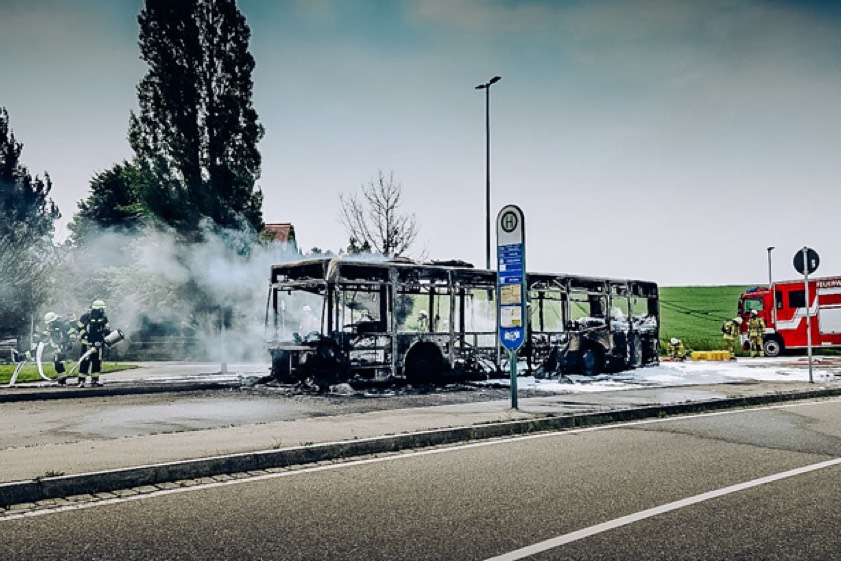 (ty) Ein Linienbus ist am gestrigen Dienstag in Hebertshausen (Kreis Dachau) zum Raub der Flammen geworden. Laut heutiger Mitteilung der Polizei war er gegen 12 Uhr im Bereich der Goppertshofer Straße während der Fahrt im Motorraum in Brand geraten. Der 45 Jahre alte Fahrer habe den Omnibus noch an einer Haltestelle am Bahnhof abstellen können. Letztlich sei das Gefährt komplett ausgebrannt. Der Fahrer sowie der einzige Passagier, der sich zu diesem Zeitpunkt an Bord befunden hatte, konnten laut Polizei das Fahrzeug rechtzeitig verlassen und blieben unverletzt.