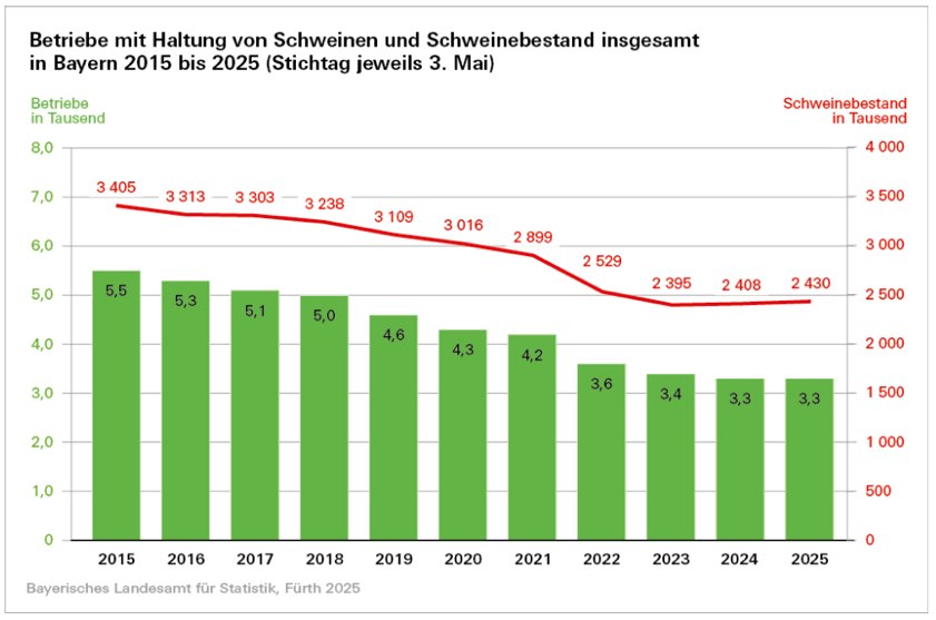 Der langjährige Trend hin zu größeren Beständen hält an. So ist die durchschnittliche Bestands-Größe in Bayern binnen Jahresfrist von 740 auf 743 Tiere pro Betrieb gestiegen. Zum Vergleich: Im Jahr 2015 entfielen auf jeden Betrieb durchschnittlich noch 621 Tiere. In den bayerischen Betrieben wurden zum genannten Stichtag heuer im Mai insgesamt 2 430 000 Schweine gehalten, was einem Plus von 0,9 Prozent oder 22 500 Tieren gegenüber dem Vorjahr entspricht.
