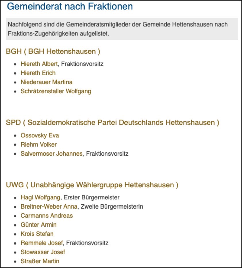 Dass der designierte Herausforderer praktisch ein Nachbar des Amtsinhabers ist, kann man noch als nette Randnotiz aus einer der kleinsten Landkreis-Kommunen vermerken. Deutlich bemerkenswerter ist hingegen, dass die Konkurrenz für Hagl sozusagen aus den eigenen Reihen kommt. Denn Carmanns hat schon mehrfach auf der UWG-Liste für den Gemeinderat von Hettenshausen kandidiert. Und bei der jüngsten Kommunalwahl im Jahr 2020 gelang ihm dann für die UWG auch der Einzug ins Gremium. Auf der Internet-Seite der Kommune wird er aktuell als Mitglied der UWG-Riege gelistet (siehe Screenshot unten). Carmanns selbst sieht sich als "praktisch fraktionslos", wie er auch angesichts der angestrebten Bürgermeister-Kandidatur gegenüber unserer Zeitung sagt.