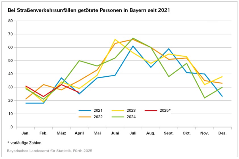 (ty) Wie das Landesamt für Statistik nach vorläufigen Ergebnissen der Polizei jetzt mitgeteilt hat, sank die Zahl der in Bayern registrierten Straßenverkehrsunfälle im April heuer gegenüber dem Vorjahres-Monat um 6,9 Prozent von 34 039 auf 31 675. Dabei kamen in 3790 Fällen auch Menschen zu Schaden – verglichen mit April vergangenen Jahres ein Rückgang um 13,7 Prozent. Die Zahl der verunglückten Personen sank um 16,4 Prozent auf 4721. Wie die Behörde weiter mitteilt, kamen im April heuer 26 Verkehrsteilnehmer ums Leben, im Vorjahres-Monat waren es 50. Insgesamt 678 Personen wurden schwer verletzt (minus 23,0 Prozent) und 4017 wurden leicht verletzt (minus 14,9 Prozent).