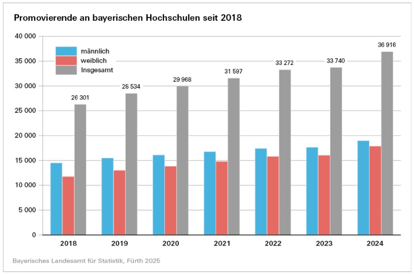 Das Durchschnitts-Alter der Promovierenden im Freistaat lag im vergangenen Jahr bei 31,6 Jahren. Im vergangenen Jahr haben sich insgesamt 6454 Personen erstmalig für eine Promotion in Bayern registriert. Das sind 8,4 Prozent beziehungsweise 500 Personen mehr als im Vorjahr. Demgegenüber haben 4729 Personen ihr Promotions-Verfahren im vergangenen Jahr im Freistaat abgeschlossen.