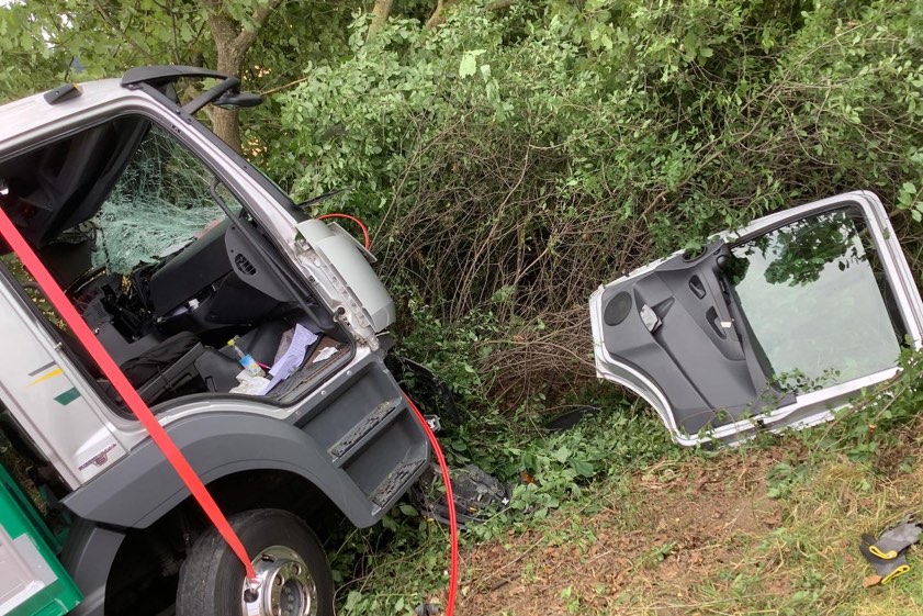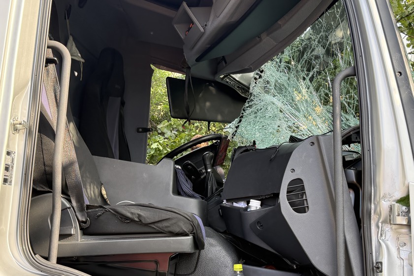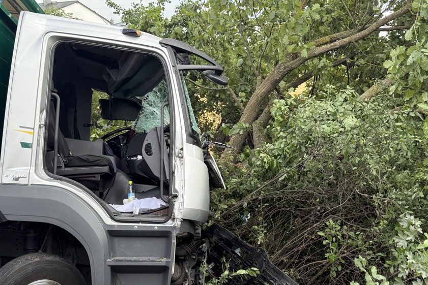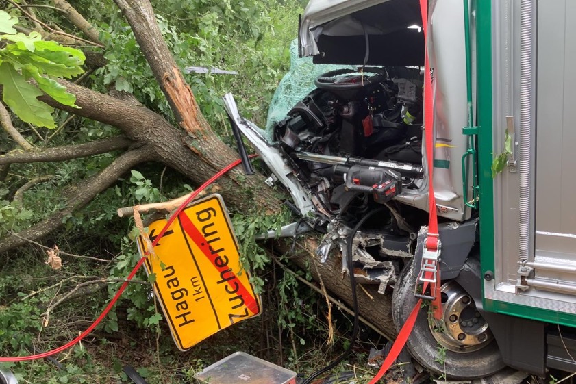 73-Jähriger kam gestern aus unbekannter Ursache mit dem Lkw von der Strecke ab und prallte gegen einen stattlichen Baum. Feuerwehr musste ihn befreien.