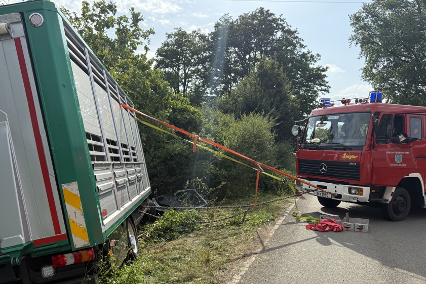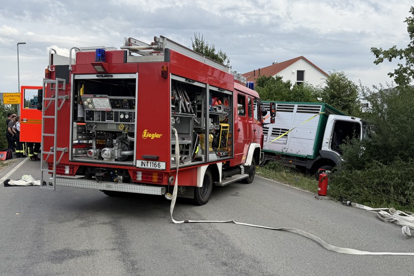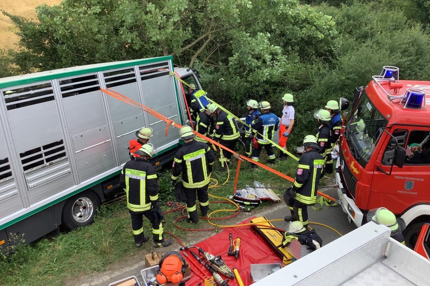 Nach Angaben der Polizei war der 73-Jährige mit dem Lkw auf der Weicheringer Straße in Richtung Hagau unterwegs, als kurz vor der Ortsausfahrt von Zuchering der Unfall passierte. Aus bislang nicht bekannten Gründen sei sei der Lastwagen "alleinbeteiligt und ohne Fremdeinwirkung" nach links von der Strecke geraten. "Der Lkw, welcher mit einem ausgewachsenen Stier beladen war, stürzte etwa zwei Meter die Böschung herab und kollidierte mit einem massiven Baum." Durch diesen Zusammenstoß sei der 73-Jährige im Fußbereich in seiner Fahrer-Kabine eingeklemmt worden. Die Berufsfeuerwehr aus Ingolstadt sowie die Freiwilligen Feuerwehren aus Zuchering, Hagau und Brunnenreuth rückten laut Polizei mit einem Großaufgebot an der Unfallstelle an.