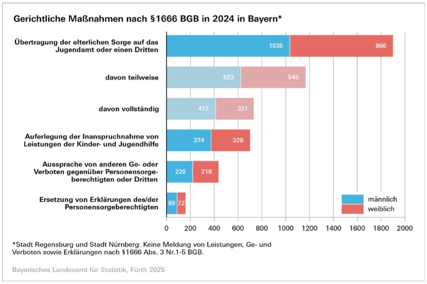 (ty) Im Freistaat sind im vergangenen Jahr – basierend auf insgesamt 2412 Anrufungen des Familiengerichts aufgrund von Kindeswohl-Gefährdung – unterm Strich 3202 gerichtliche Maßnahmen eingeleitet worden. Zum Vergleich: Im Jahr davor lag die Zahl der angeordneten Maßnahmen bei 3103. Die Maßnahmen im Jahr 2024 betrafen laut Landesamt für Statistik mit 53,7 Prozent (1718) überwiegend männliche Minderjährige. Mit 43,6 Prozent (1396) wurden Maßnahmen am häufigsten für Kinder und Jugendliche im Alter von sechs bis unter 14 Jahren angeordnet.