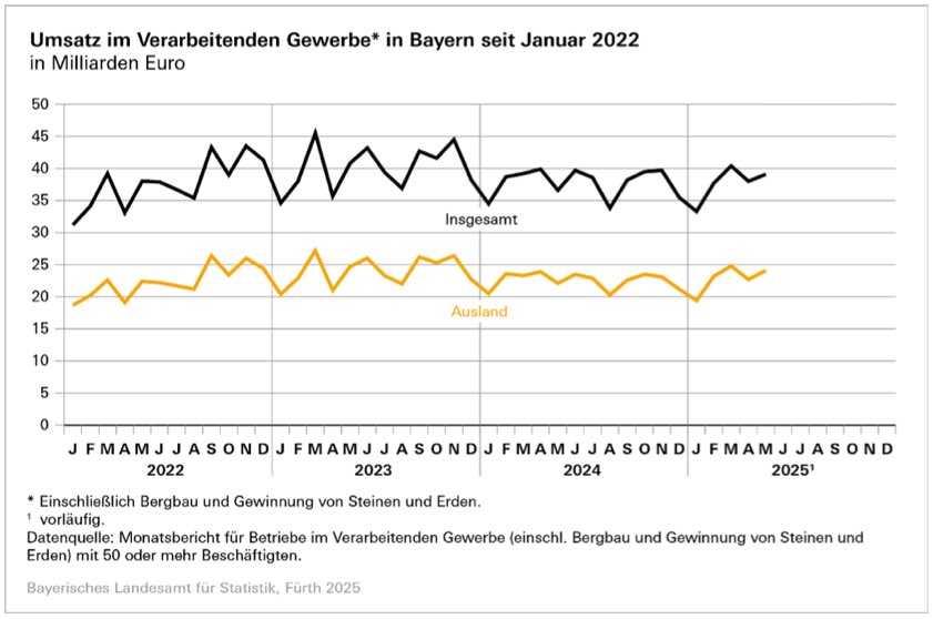 (ty) Im Mai dieses Jahres hat das verarbeitende Gewerbe im Freistaat ein Umsatz-Plus von nominal 6,9 Prozent gegenüber dem Vorjahres-Monat verzeichnet – und zwar auf 39,1 Milliarden Euro. Das Verarbeitende Gewerbe, bezogen auf Betriebe mit 50 oder mehr Beschäftigten, umfasst dabei auch immer den Bergbau und die Gewinnung von Steinen und Erden. Wie das bayerische Landesamt für Statistik weiter mitteilt, entfielen von den 39,1 Milliarden Euro des Gesamt-Umsatz rund 24,1 Milliarden Euro auf Umsätze mit dem Ausland (plus 9,1 Prozent) und darunter rund 7,4 Milliarden Euro auf Umsätze mit den Ländern der Euro-Zone (minus 1,2 Prozent). Die Anteile der Auslands-Umsätze und der Umsätze mit den Euro-Zonen-Ländern am gesamten Umsatz machten 61,7 beziehungsweise 18,8 Prozent aus.