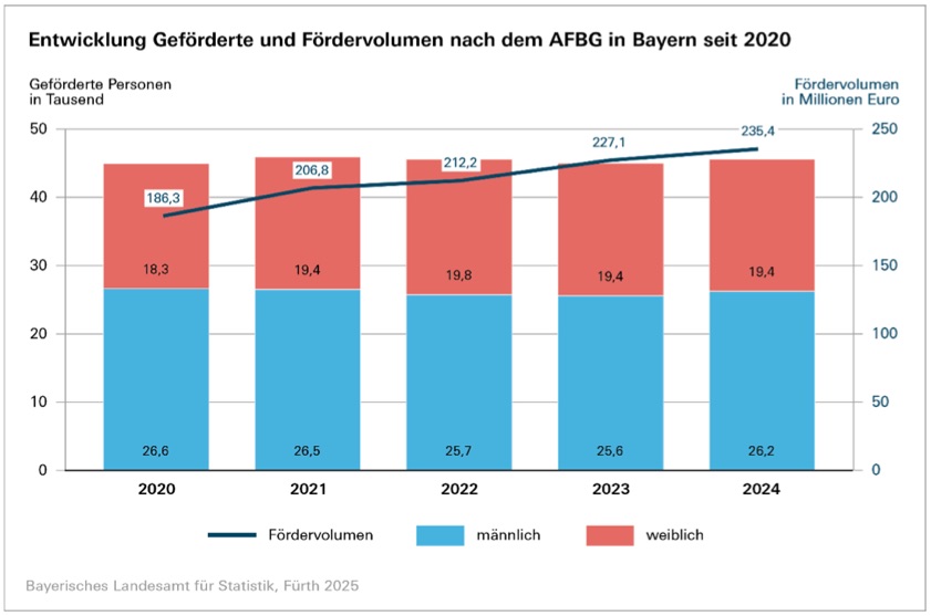 (ty) Wie das Landesamt für Statistik jetzt mitgeteilt hat, wurden im vergangenen Jahr in Bayern 45 623 Personen mit Leistungen nach dem Aufstiegs-Fortbildungs-Förderungs-Gesetz (AFBG), dem so genannten Aufstiegs-Bafög, ge- fördert. Die Zahl der Geförderten stieg gegenüber dem Vorjahr um 606 Personen oder 1,3 Prozent. Passend zur Gesamtentwicklung stiegen auch die Fortbildungen zu staatlich anerkannten Erzieherinnen und Erziehern um 3,3 Prozent auf 10 060 Teilnehmende. Mit 22,1 Prozent war dies der höchste Anteil an allen Geförderten.