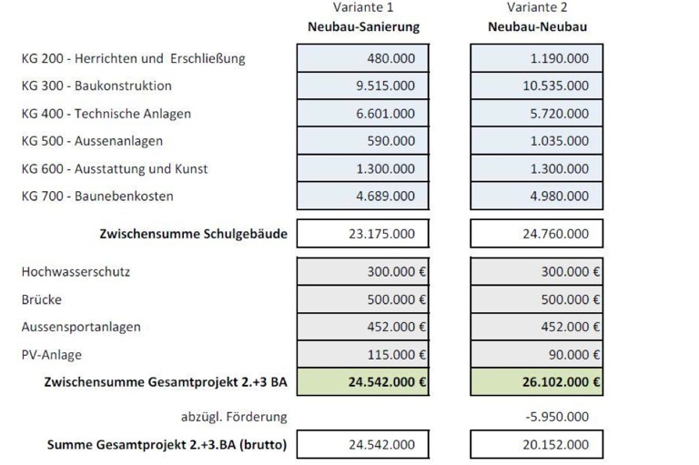 Im Raum standen zwei Möglichkeiten, zu denen vom Architekturbüro Köhler die jeweiligen Vorentwürfe vorgestellt wurden. Variante 1: Neubau der Grundschule und Sanierung der Mittelschule. Variante 2: Neubau beider Schulen. Der Doppel-Neubau würde 26,1 Millionen Euro kosten. Die Variante 1 (Neubau Grundschule/Sanierung Mittelschule) käme mit 24,5 Millionen Euro zwar auf den ersten Blick günstiger – doch dafür gibt es dafür keinen Zuschuss. Weil aber die Finanzspritze der Regierung von Oberbayern für den Doppel-Neubau fast sechs Millionen beträgt, kostet diese Variante die Stadt „nur“ 20,1 Millionen Euro und kommt damit sogar um rund 4,4 Millionen Euro günstiger.