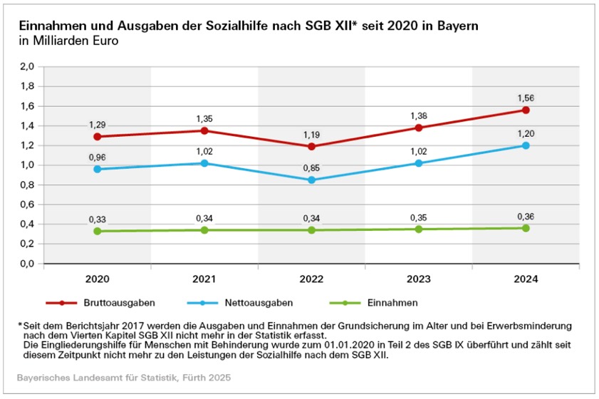Seit dem Berichtsjahr 2017 werden die Ausgaben und Einnahmen der Grundsicherung im Alter und bei Erwerbsminderung nach dem vierten Kapitel des SGB XII nicht mehr in der Statistik erfasst. Nach Angaben des Bundesministeriums für Arbeit und Soziales lagen die Netto-Ausgaben für diesen Leistungs-Bereich im vergangenen Jahr in Bayern bei 1,33 Milliarden Euro.