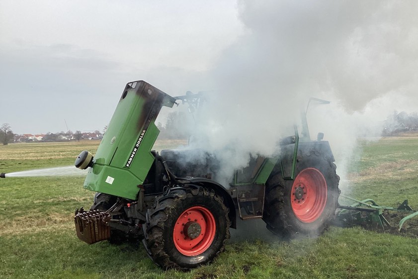 Das landwirtschaftliche Gefährt geriet am gestrigen Nachmittag während Feldarbeiten in Flammen. Als Ursache gilt ein technischer Defekt.