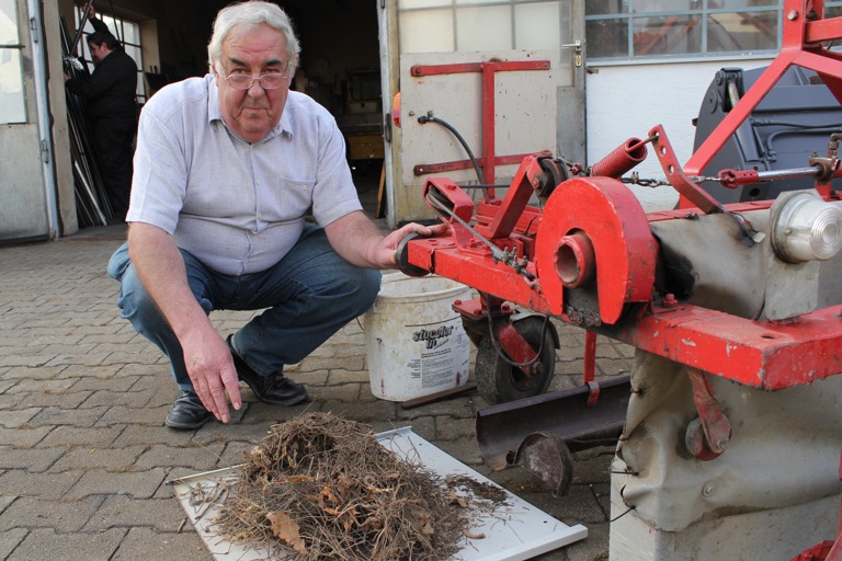 Josef Gratzl hat ein Gerät entwickelt, mit dem er die für Autoreifen so gefährlichen Hopfenspikes von der Straße sammelt – auch VW hat sich für ein Werksgelände von ihm schon eine ähnliche Apparatur anfertigen lassen
