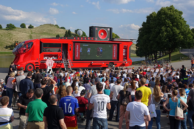 Wer das verrückteste Gruppenbild macht, zu dem kommt zum Finale der Fußball-WM der knallrote Media-Markt-Truck mit seiner LED-Leinwand zum Public-Viewing